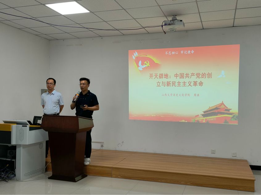 “学史知来,初心如磐”,为庆祝中国共产党成立100周年,深入学习贯彻习近平总书记在党史学习教育动员大会的重要讲话精神,在“学党史、悟思想”中不断唤醒红色基因、坚定理想信念,2021年6月2日,山西大学新闻学院特邀山西大学历史文化学院教授、博士生导师、山西大学民间文献整理与研究中心执行主任、山西省中共党史人物研究会副会长周亚在新闻学院大会议室作题为《开天辟地:中国共产党的创立与新民主主义革命》的专题讲座。新闻学院研究生第二党支部书记郝强老师主持讲座,新闻学院本科生和研究生党员、积极分子到场聆听。