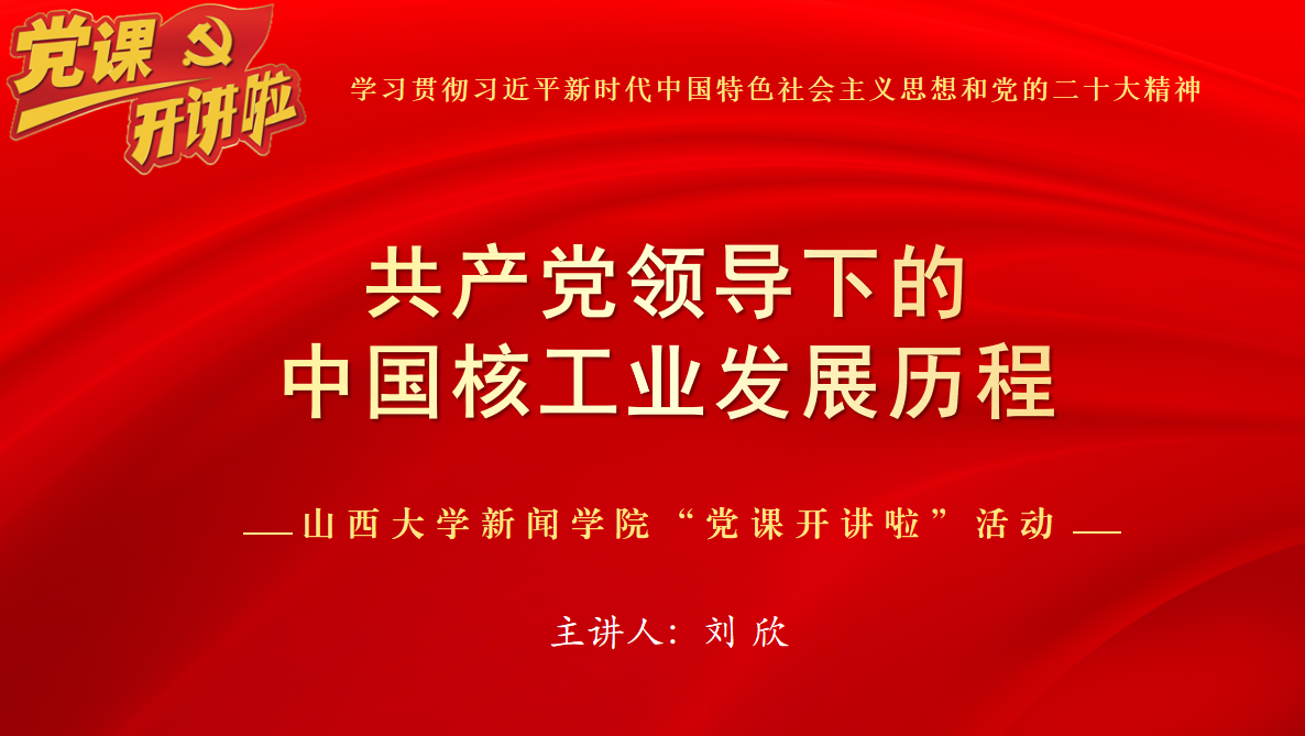 核工业是高科技战略产业,是国家安全的重要基石。为深入贯彻落实习近平总书记关于核工业的重要指示批示精神,纪念中国第一颗原子弹爆炸成功60周年,大力弘扬“两弹一星”精神与核工业精神,坚定文化自信,强化责任担当,铸就民族之魂,5月10日下午,山西大学新闻学院研究生党支部于商学楼B206教室开展第二期“党课开讲啦”专题活动。本次党课的主题是“党领导下的中国核工业发展历程”,由新闻学院“两弹一星”精神志愿宣讲团刘欣老师主讲。