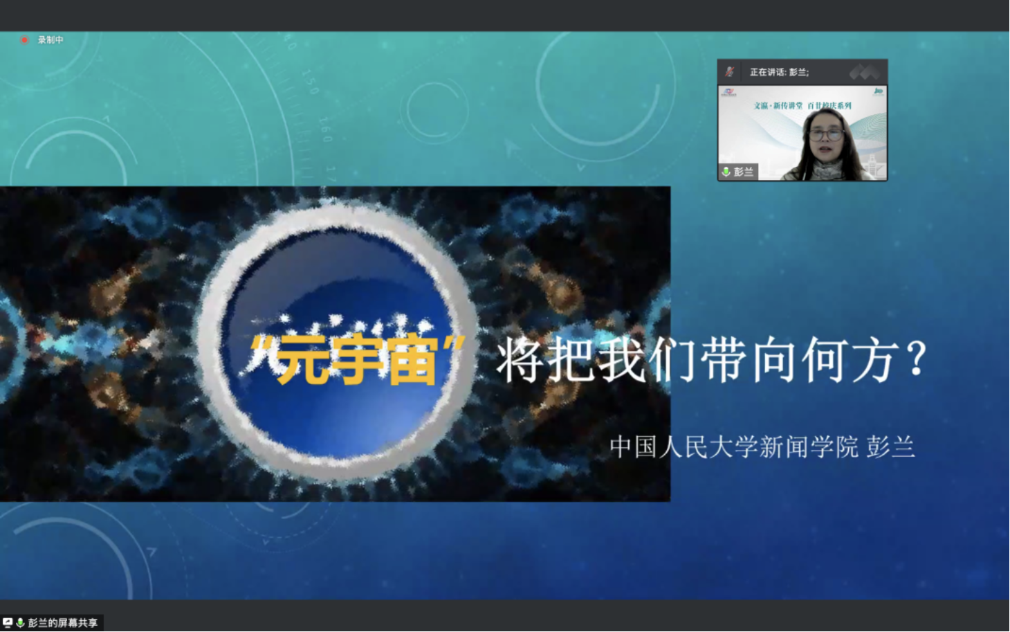 2022年11月9日19点,新闻学院“文瀛·新传讲堂 百廿校庆系列”第一讲成功举办,本次讲座的主讲人为教育部“**”特聘教授,中国人民大学新闻学院教授、博士生导师,中国人民大学新闻与社会发展研究中心研究员彭兰教授,讲座主题为“元宇宙将把我们带向何方?”。山西大学新闻学院李雪枫教授担任点评专家,庞慧敏院长担任主持人,新闻学院全体师生在线上共享学术盛宴。讲座备受关注,开讲之前腾讯会议即出现满员的情况,在全院师生和其他业界、学界人士高涨的学习热情中展开。