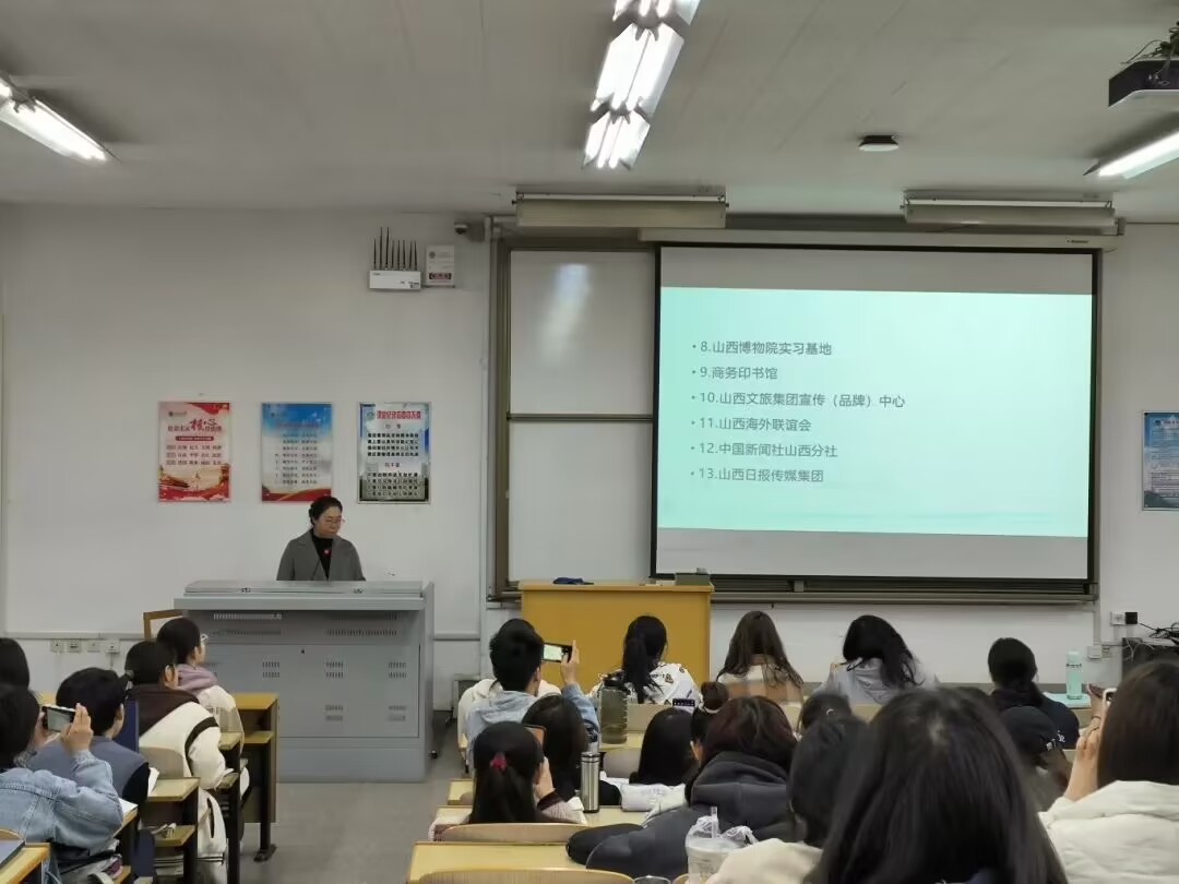 韩晓芳老师讲解了新闻学的专业特色、培养目标、课程内容、实践基地和毕业去向,她用过往亲身经历以及其所带往届生的实践经验,为23级学生的专业分流去向进行了明确的指导。