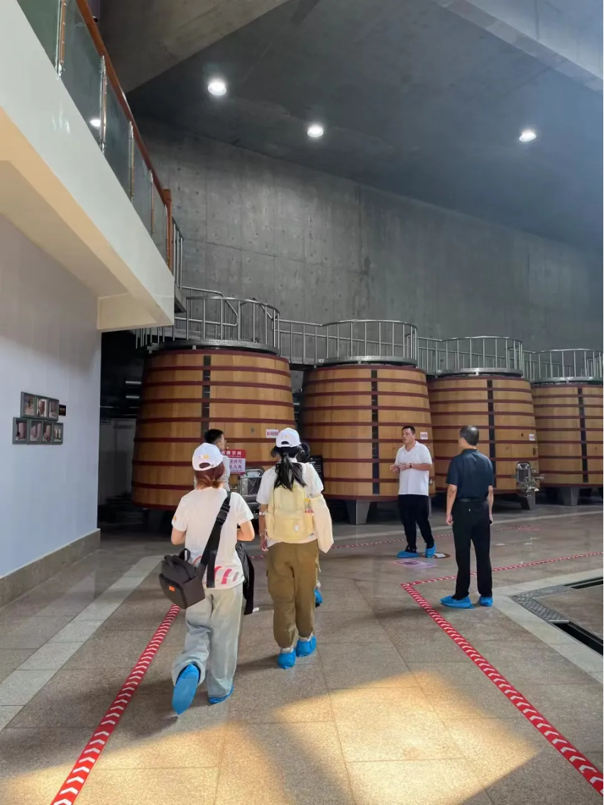 早上8点30分,第一队的队员们已整装待发。队伍首先参观了尧京酒庄。在工作人员的讲解下,我们了解到每一颗葡萄的故事与每一道工序的匠心。“尧京酒庄,道法自然,帝酒天成”,这里不仅有美酒的芬芳,还有酿造工艺的精湛,更有文化传承的深远。