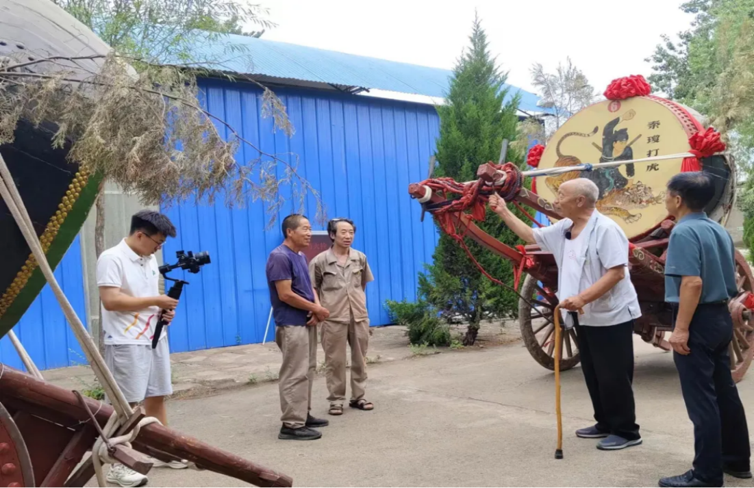 与此同时,另一队来到了鼓车前。在古老村落的心脏地带,尉村的鼓车犹如时光的守护者,静静诉说着往昔的辉煌。它们不仅是木材与铁钉的巧妙结合,更是匠人智慧与岁月沉淀的结晶。古老的鼓车,经过两千余年的传承早已成为一种文化的载体。随着相机的录制声响起,历史的回响被永久记录。紧接着,我们操控着无人机,从空中俯瞰那些历经风雨的古建筑,仿佛在诉说着千年的故事。
