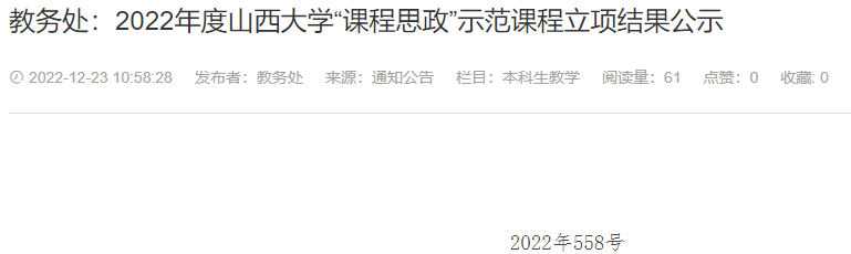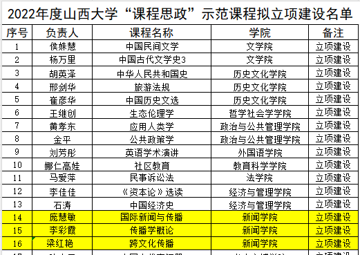 近日,山西大学教务处发布了2022年度山西大学“课程思政”示范课程立项结果,我院有3门课程获批校级课程示范课程,分别是《国际新闻与传播课程》《传播学概论》《跨文化传播》。