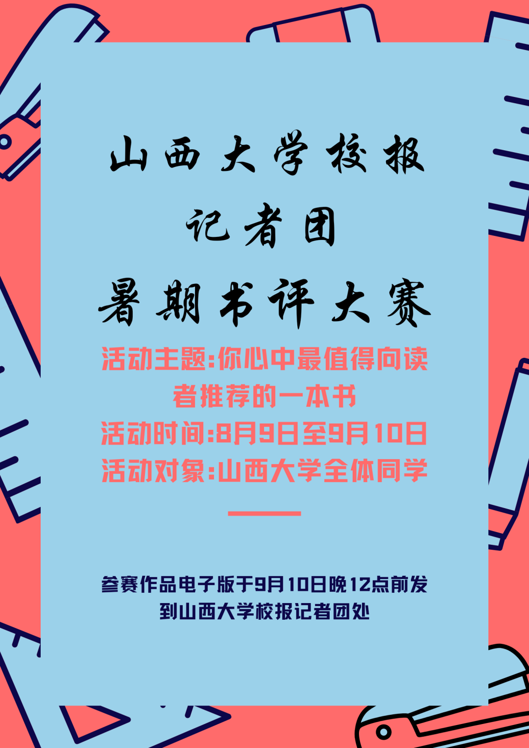 6、投稿为线上活动,参赛作品电子版于9月10日晚12点前发到山西大学校报记者团处(扫描文末二维码与编辑取得联系)。
