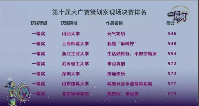 第十届大广赛共有1449所高校参赛,共收到策划案作品8137件,经过校级初评及赛区评选,共1422件作品入围全国总评审。经过两轮评审,最终245件作品获得全国优秀奖,71件作品获得全国三等奖,39件作品荣获二等奖及以上,其中最优秀的13件作品的创作团队在此次策划案现场决赛的舞台上争夺一等奖桂冠。