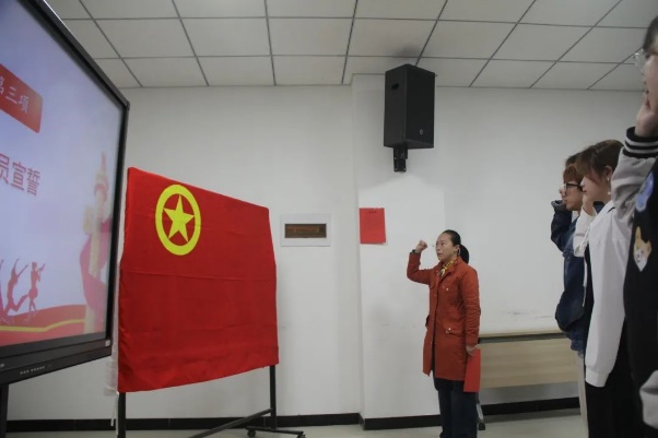 在鲜艳的团旗下,领誓人张丽老师带领新团员们高举右手进行庄严宣誓。同学们个个言辞坚定,深切表达了自己入团的坚定意愿和一心向团的决心。