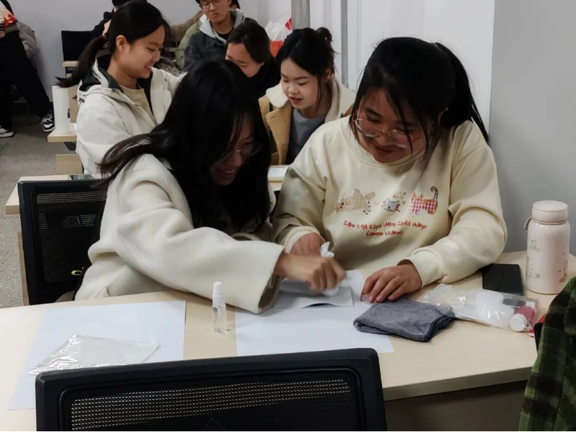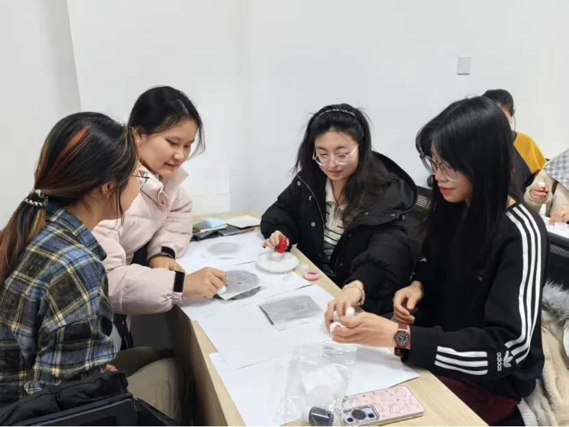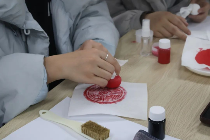 讲授完毕后,进入了同学们最期待的拓印体验环节。负责人把事先准备材料好的材料发给同学们,其中有拓印使用的宣纸、墨水、拓包、刷子、喷壶、瓦当。
