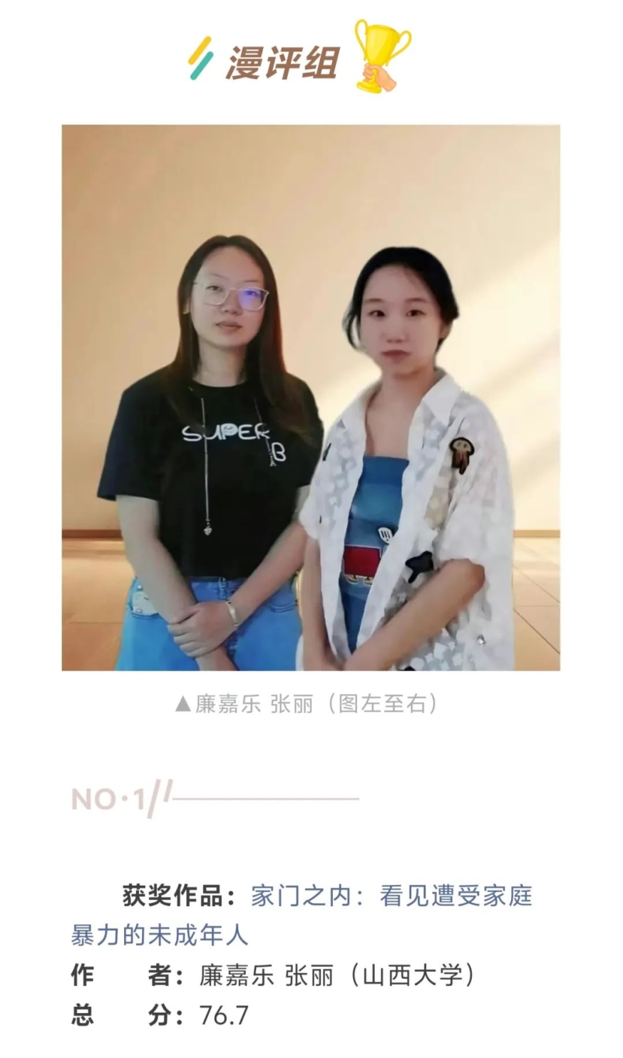 近日,红网第10届全国大学生“评论之星”选拔赛12月月赛榜单出炉。我院2021级本科生廉嘉乐(广告学)和张丽(新闻学)合作的漫画评论作品《家门之内:看见遭受家庭暴力的未成年人》获漫评组一等奖。