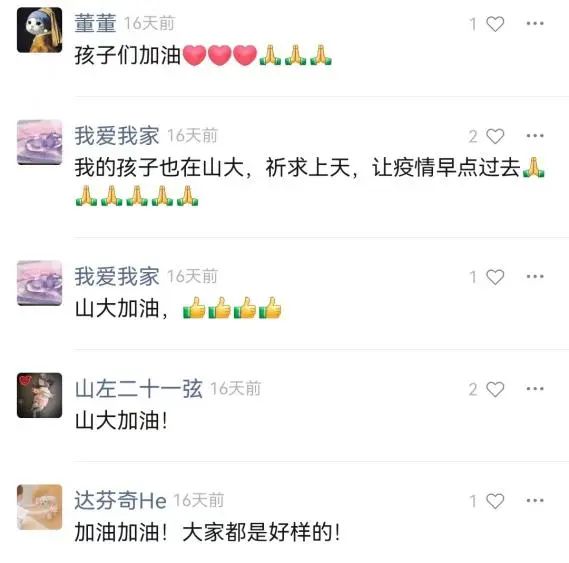 该视频发布后获得了很多网友的关注,来自各方的鼓励涌入评论区:“同是山大在校生,期待我们再相逢!”“05/06级学长学姐给学弟学妹加油!”“可爱的孩子们,一起加油!回来看令德湖水,闻丁香花香!”受其影响,不少与陶致桦熟识的师生也纷纷将遇到的感人故事记录下来,连夜将视频素材发给他。“手机一直在响,大家发来了很多的山大抗‘疫’瞬间。事实证明,这是一座充满爱与希望的校园。”大家希望让更多人看到这些“瞬间”,传递这份温暖人心的力量。