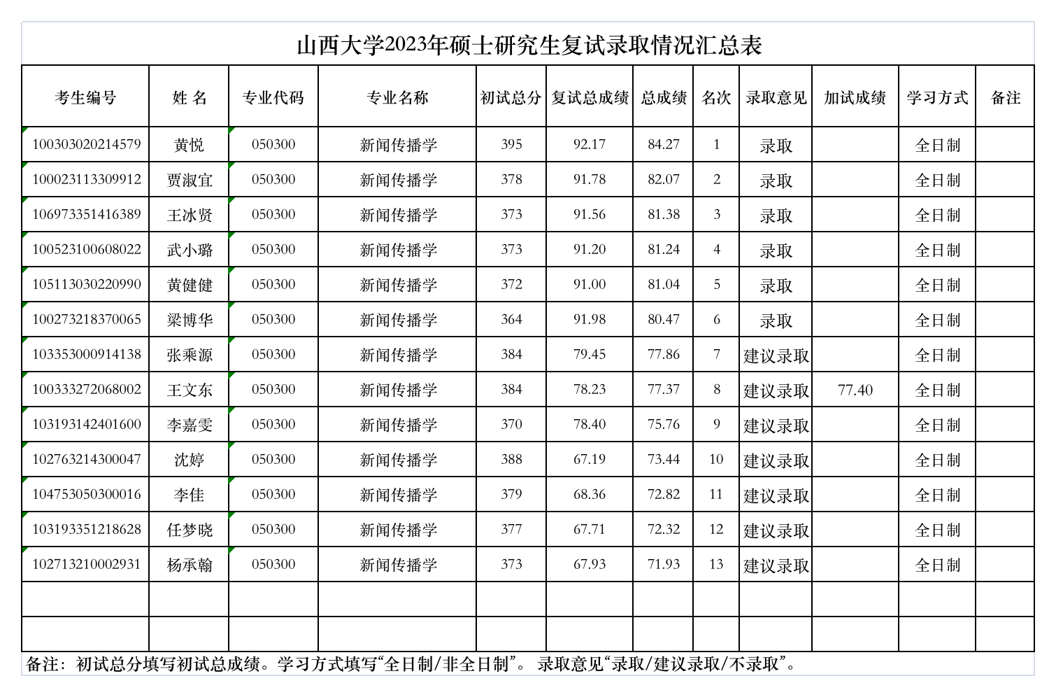 山西大学2023年硕士研究生复试录取情况汇总表